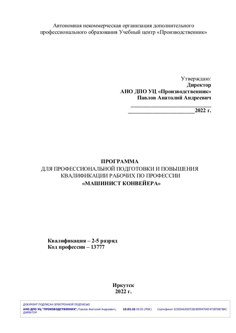 Характеристика работ. Управление конвейерами, элеваторами, шнеками, питателями, перегрузочными тележками, приводной станцией конвейера. Реверсирование и переключение движения конвейеров, регулирование степени их загрузки. Регулирование натяжных устройств и хода ленты. Наблюдение за исправным состоянием перегрузочных течек, натяжных барабанов, редукторов питателей, автоматических устройств, установленных на конвейере, за правильной разгрузкой материалов в приемные агрегаты. Участие в наращивании и переноске конвейеров, соединении лент и цепей. Координация работы самоходного конвейера с работой экскаватора. Смазка роликов и привода, очистка ленты, роликов, роликоопор и течек. Замена вышедших из строя роликов. Удаление с конвейерной ленты посторонних предметов, уборка просыпавшейся горной массы. Ликвидация заторов в лотках. Выявление и устранение неисправностей в работе обслуживаемого оборудования, его очистка. Смыв сливных канавок в маслостанциях.